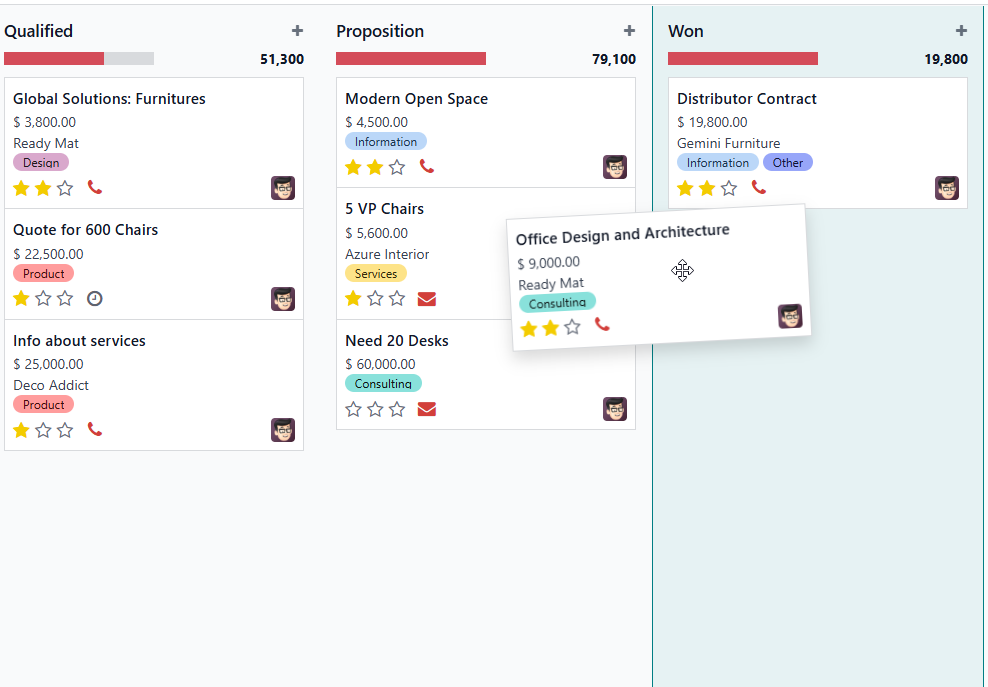 De Kanban-lay-out rangschikt kansen volgens hun huidige fase. Je kunt ze gemakkelijk verplaatsen in de pijplijn door ze te slepen en neer te zetten.