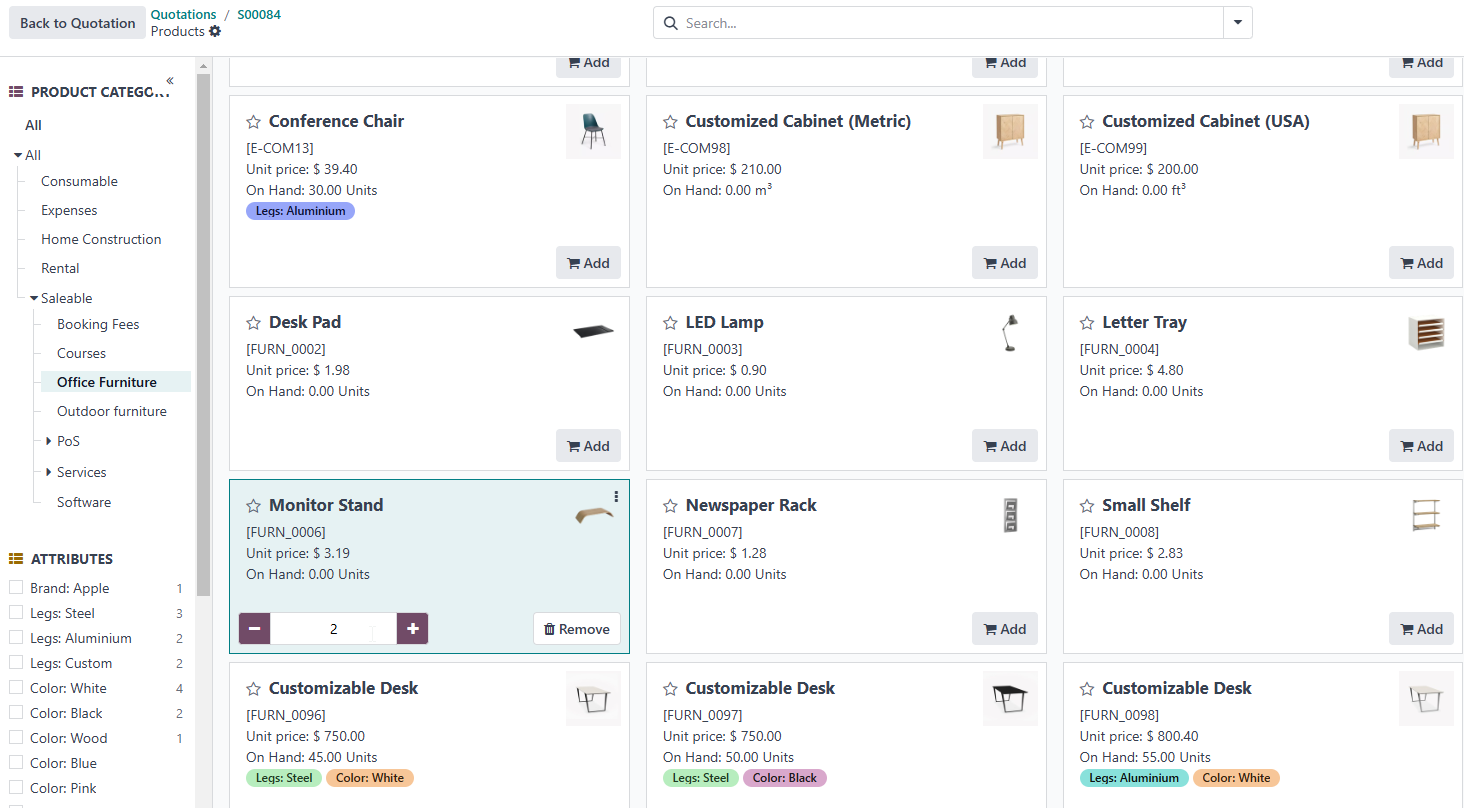 Genereer snel professionele offertes met behulp van een eenvoudig te navigeren interface. Kies je producten uit de catalogus en laat Odoo de rest regelen.