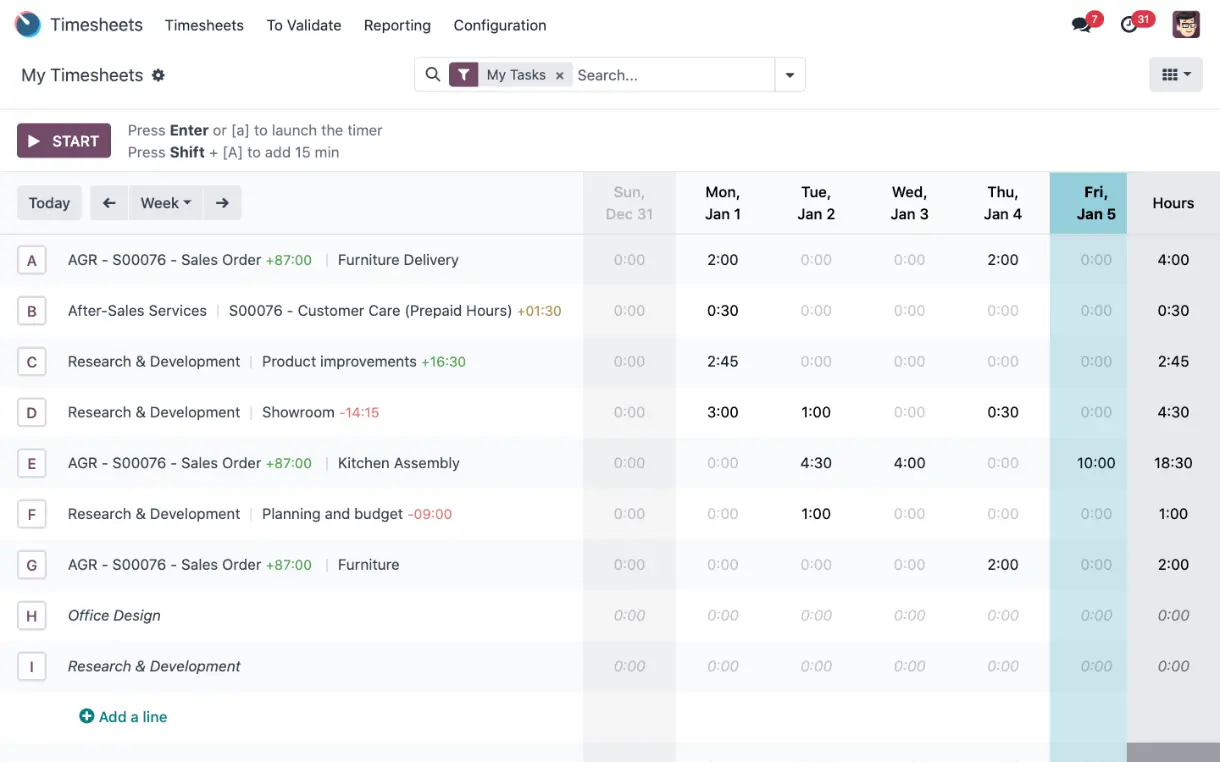 Met Odoo Timesheets kan je team factureerbare uren registreren en valideren, de tijd goedkeuren die is besteed aan verschillende taken en het facturatieproces voor je diensten vereenvoudigen. Alles in één gebruiksvriendelijk platform.